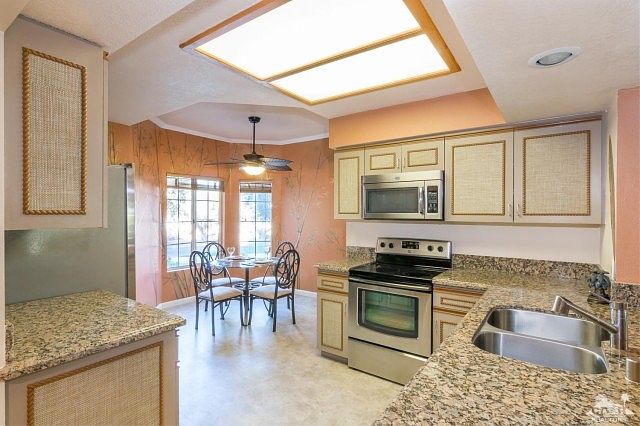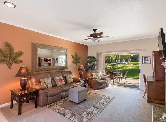 Beautiful, custom remodeled two bedroom, lower level condo. This south facing Desert Falls property has the ideal location - close to a pool, but not too close, on an expansive greenbelt crowned with stunning blue skies. Imagine relaxing on your back patio drenched in sun most of the day! Inside, the custom remodel includes ample use of slab granite, custom paint, picture perfect murals, and an opened up kitchen. Turnkey furnished - the furnishings are sure to enhance your comfort and enjoyment! The Desert Falls community is centrally located mid-valley with easy access to I-10; walking distance to retail, restaurants (both fast foods and fine dining), and groceries.