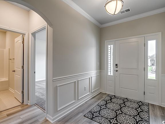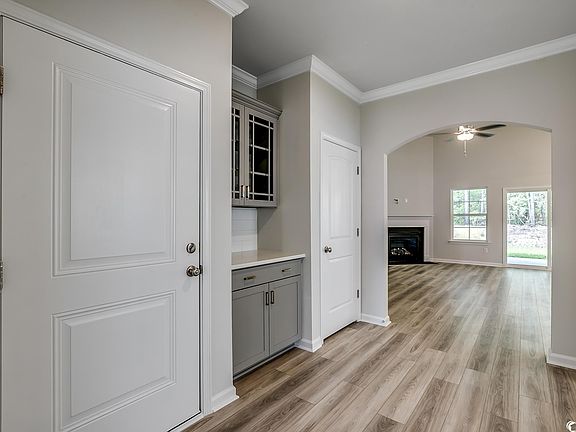 Ready in early December, want a smaller, manageable home but still want some nice touches? You found it in this Allerton home plan! The elegant foyer with judge’s panels, chair rail, crown molding and archway welcomes you into the home. The great room and kitchen will have 12 ft vaulted ceilings and the primary bedroom will have a 10 ft ceiling. Along with the large rear covered patio, you'll feel like you're living in a larger home! The corner gas fireplace provides a warm ambiance you desire on those cool days. Flush quartz countertops, single bowl sink, upgraded cabinetry with soft close, under cabinet lighting, tile backsplash, and a GE dual fuel range are among the features found in the kitchen. The primary suite and bath will include raised double bowl vanity with quartz, tiled shower with glass enclosure, and a generous walk-in closet. Other features will include ceiling fans, a butler’s pantry, quartz vanity in the 2nd bath, and flooring consisting of ceramic tile in the baths, plush carpet in the bedrooms, and luxury vinyl plank throughout the rest of the home. Smart home automation is also included! Our 1-2-10 year warranty will give you peace of mind. Superior energy efficient construction includes 15 SEER HVAC and R-38 ceiling insulation. Photos shown are of an Allerton in another community, with different options and colors. Features, colors, and options will vary.