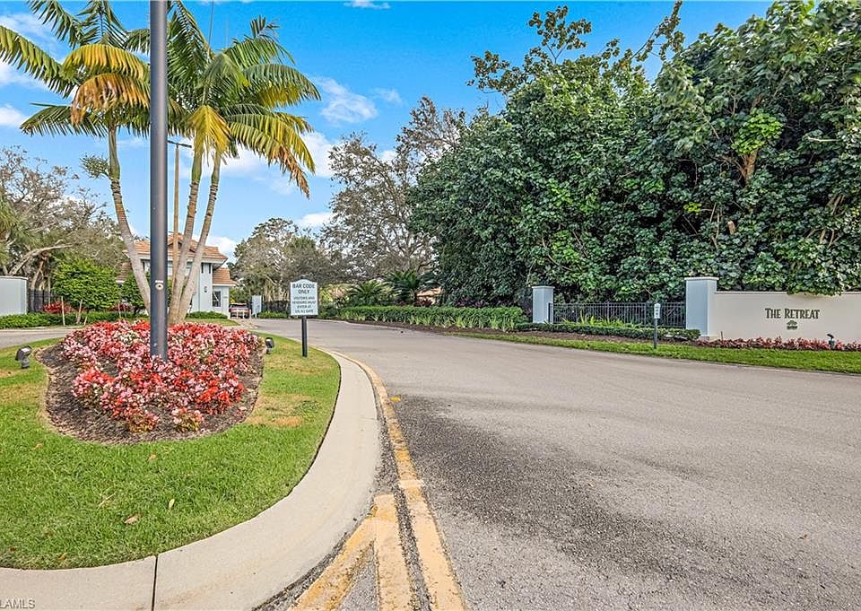 C14100 Enjoy a beautiful view of a lake and a landscaped area from this spacious end-unit condominium with a coveted southwestern exposure. You will appreciate the updated baths with granite vanity tops, and your guests will appreciate the multiple shower heads in the guest bath shower. In addition, there is crown molding, custom closets, convenient built-in seating in the kitchen area, and storm protection on the lanai. There is a newer washing machine, dishwasher, Trane air conditioner, and roof. All this, plus a storage unit outside the condo and a detached single-car garage. The Retreat is a guard-gated, low-density community west of Route 41 and is close to the beaches, restaurants, and shops. Enjoy the peaceful walking paths, play tennis, or relax at the sparkling pool and spa that overlook the lake!