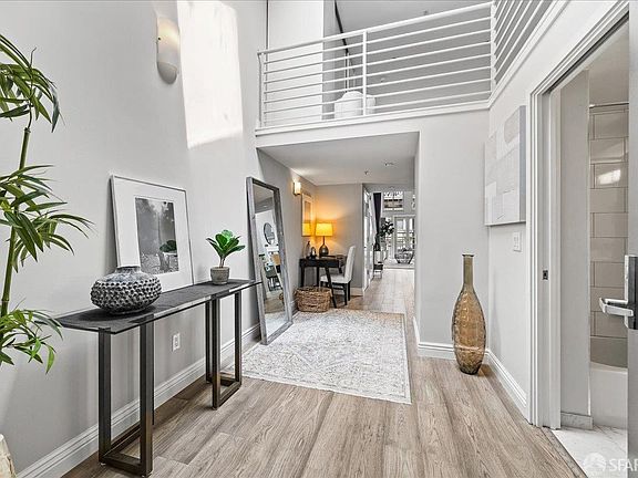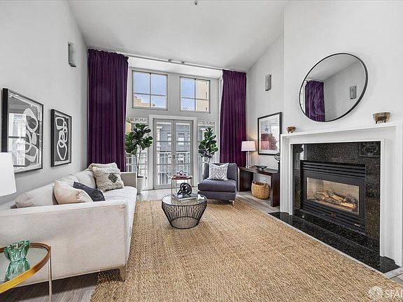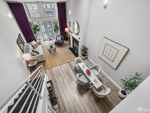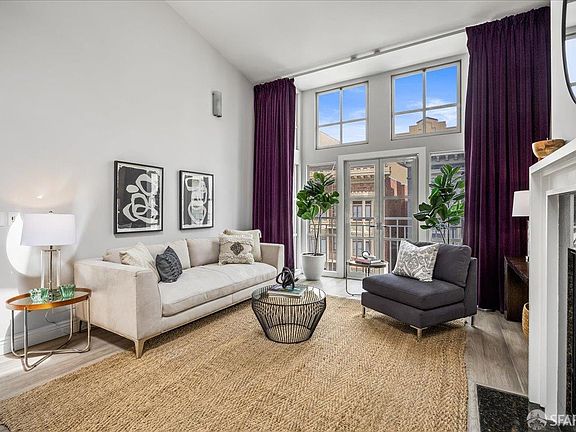 Located in vibrant Lower Nob Hill, this striking one-bed, two-bath loft condo offers a blend of modern sophistication and exceptional value. The expansive open-concept living/dining area is framed by a dramatic wall of French doors, skylights and soaring windows, bathing the space in natural light to create an airy ambiance. A sleek fireplace adds warmth to this refined urban retreat. The kitchen features granite counters, stainless appliances, and generous cabinet space. A full bath and laundry closet complete the main level. Ascend to the mezzanine bedroom, where skylights invite the morning sun and a private balcony offers a tranquil escape. The ensuite second bath enhances privacy and comfort. Residents enjoy access to a spacious common-area patio, an inviting venue for weekend BBQs and social gatherings. Additional amenities include one onsite parking, storage cage, Webpass internet, and Swiftlane video entry system. With a downtown location steps from shopping, restaurants, and cultural landmarks, this condo offers easy access to Civic Center, Hayes Valley, Union Square, Market St, Van Ness/101, MUNI, and BART. Whether you're seeking a stylish pied-a-terre, or full-time residence, this home delivers a balance of comfort, convenience, and cosmopolitan flair.