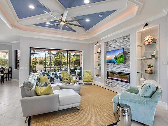 Welcome to this highly sought-after boating community home within the gates of Harbour Walk. This modern, clean and crisp interior combined with a very desirable open-floorplan is sure to impress. The home is highlighted by high ceilings, crown molding throughout, tray ceilings, built-in features, rock wall fireplace, stunning light fixtures and more. Bright, tall kitchen cabinets pop against the soothing tones of the interior. The perfect split floorplan of 3 bedrooms also includes a large bonus room perfect for an office, extra company, a playroom for children, or a den. Entertaining is a breeze in the open kitchen which is in the heart of the home. Guests can easily mingle throughout the open floorplan and then take the event out to the gorgeous pool lanai which features a covered living area that surrounds a refreshing pool with a relaxing heated spa. Enjoy your boat more often when it is docked right in your own backyard! It is an easy and convenient way to boat anytime you please. Boat to the Manatee River, Sarasota Bay and the Gulf of Mexico in minutes with restaurants & fuel stops conveniently along the way. The gated community is ideally situated 2 miles from I-75 to allow easy access to all conveniences including many restaurants, plenty of shopping, 3 major airports, & much more. Harbour Walk features a guarded gate, playground, tennis courts, a walking trail, observation pier & no CDD fee.