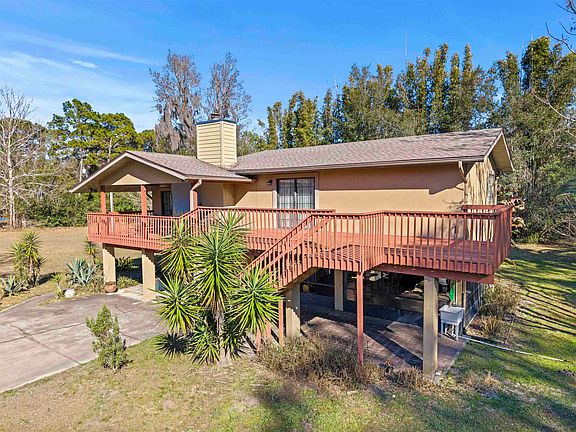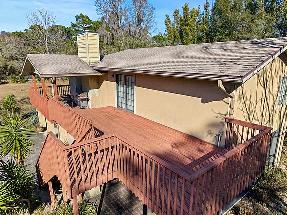 A rare home-and-business opportunity on 1.9 fully fenced acres! This exceptional property offers the perfect blend of comfortable living, wide-open space, and serious functionality. The two-story residence features 3 bedrooms and 2.5 bathrooms with room to grow, complemented by multiple outdoor living areas designed to embrace the surrounding landscape. Inside, you’ll find a warm mix of wood and tile flooring, abundant natural light, and two expansive living areas—one on each level. The upstairs living room showcases a beautiful stone fireplace and flows into a large open kitchen, ideal for entertaining or everyday living. The primary suite is a true retreat with a cathedral ceiling, an oversized walk-in shower, and a jumbo soaking tub. Large windows throughout the home bring the outdoors in and highlight the property’s peaceful setting. Outdoor living truly shines here with multiple exterior decks stretching approximately 50 feet wide, plus a 26’ x 19’ tiled, screened room on the first floor—perfect for relaxing, dining, or entertaining year-round. For those needing space to work, create, or store, this property delivers in a big way. The 2,000 sq. ft. concrete block barn is ideal for a home-based business and currently offers four horse stalls, with ample land to accommodate horses. A 24’ x 23’ workshop building adds even more flexibility, while a separate structure housing the water softener system keeps utilities neatly organized. There’s even a chicken coop tucked along the edge of the property for those seeking a more self-sufficient lifestyle. With a wide-open front and backyard, plenty of room for gardening, recreation, or expansion, this property is well-suited as a primary residence, vacation home, investment property, or live-work compound. This is truly a must-see property—the space, versatility, and potential must be experienced in person to be fully appreciated. Rural zoning excellent for keeping animals NO HOA, Save storage fees...plenty of room for boats, RV and trailers on site. Location, Location, Location... This amazing home site is located just minutes away from shopping, 15 minutes to the beach and 20 minutes to the Historic downtown St Augustine.
