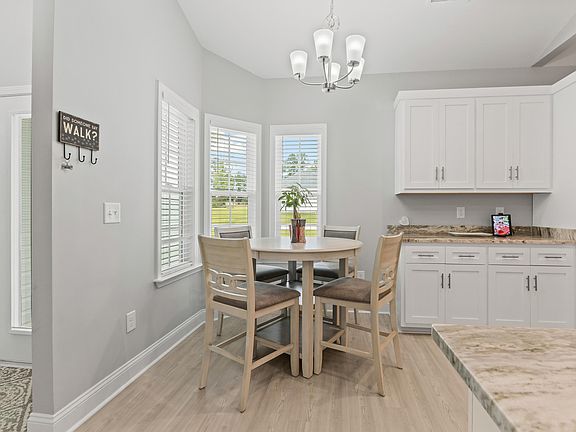 Discover your perfect retreat in this stunning home, beautifully situated on an expansive 1/3-acre lot that offers a serene backdrop of mature trees, a pond, and the lush fairways of Diamondback Golf Course. As you approach, the home's exceptional curb appeal captivates with elegant stacked stone accents and well-maintained landscaping, inviting you inside to explore its refined interior. Step through the front door and into the spacious great room, where an open layout and a modern, neutral color scheme create an inviting atmosphere perfect for relaxation and entertaining. Your attention will be drawn to the expansive gourmet kitchen with white cabinets, granite countertops, breakfast bar, pantry, and dining area. Abundant windows flood the living area with natural light, enhanced by a vaulted ceiling that adds a sense of openness and airiness, complemented by a ceiling fan for ultimate comfort. This thoughtful split floor plan ensures privacy, with two generously sized bedrooms on one side of the home sharing a well-appointed full bathroom. On the opposite side, the master suite is a true sanctuary, highlighted by a tray ceiling and a large walk-in closet. The en-suite master bathroom is a spa-like haven, boasting a transom window that fills the space with natural light, dual sinks, linen storage, a relaxing soaking tub, and a luxurious tile shower. Additional upgrades throughout the home include waterproof luxury vinyl plank flooring, tile flooring and granite countertops in both bathrooms, and a ceiling fan in each bedroom. The exterior is equally inviting, featuring a fenced backyard and a covered back porch that offers a perfect setting for morning coffee or evening gatherings, overlooking the tranquil landscape—ideal for grilling, recreation, or pursuing hobbies. This property allows you to enjoy the best of both worlds: a peaceful country setting with the convenience of being just a short drive from essential amenities. You're within easy reach of medical centers, doctors’ offices, pharmacies, banks, post offices, and grocery stores, ensuring that everything you need is within a reasonably close proximity. Square footage is approximate and not guaranteed. The buyer is responsible for verification.