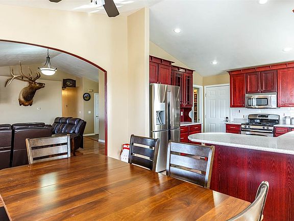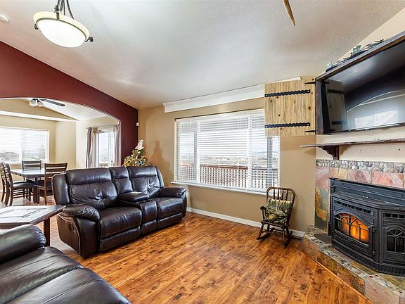 Discover all the space you need in this 5-bedroom/3-bath 3098-SF home on 3.1 acres. This custom style floor plan delivers wood laminate floors throughout, dining room w/ sliding glass door to covered deck, large kitchen w/ all appliances included, casual living room w/ pellet stove, family room w/ gas fireplace in basement w/ full bathroom, master suite with walk-in closet, whirlpool tub for relaxing nights, dual sinks, laundry room w/ sink and cabinets. Seller Offering $5,000 in Closing Cost....