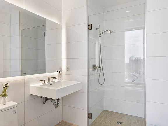 The building's amenities include a bright fitness center, game room, golf simulator, coworking lounge, conference rooms, rooftop sun deck, and a private outdoor pool located on the fifth floor. The building also offers bike storage, and private storage cages for rent with a door person present seven days a week from 11AM to 7PM.