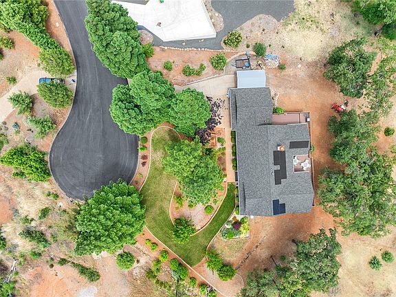 Downstairs, discover a versatile lower level—ideal for guests, a home office, or in-law quarters—featuring a secondary living room, a fourth bedroom, a fourth bathroom, and private balcony access, plus ample indoor storage. Outdoors, the 2.61-acre property invites you to embrace nature with its year-round creek, mature oaks, black oaks, maples, redwoods, and pines, creating a peaceful, park-like setting. The grounds offer RV parking, additional storage options, an oversized two-car garage, and an unfinished basement storage area.