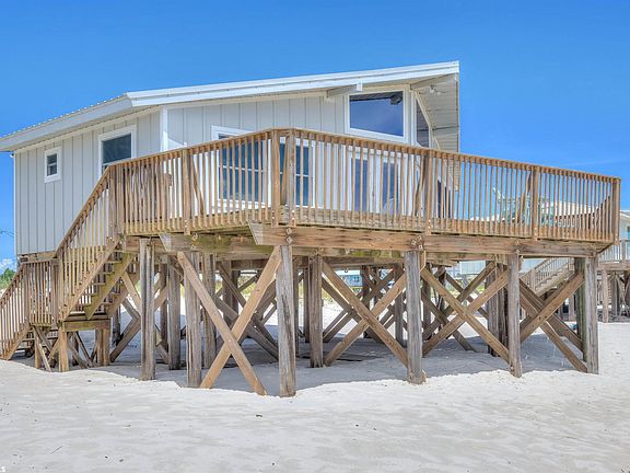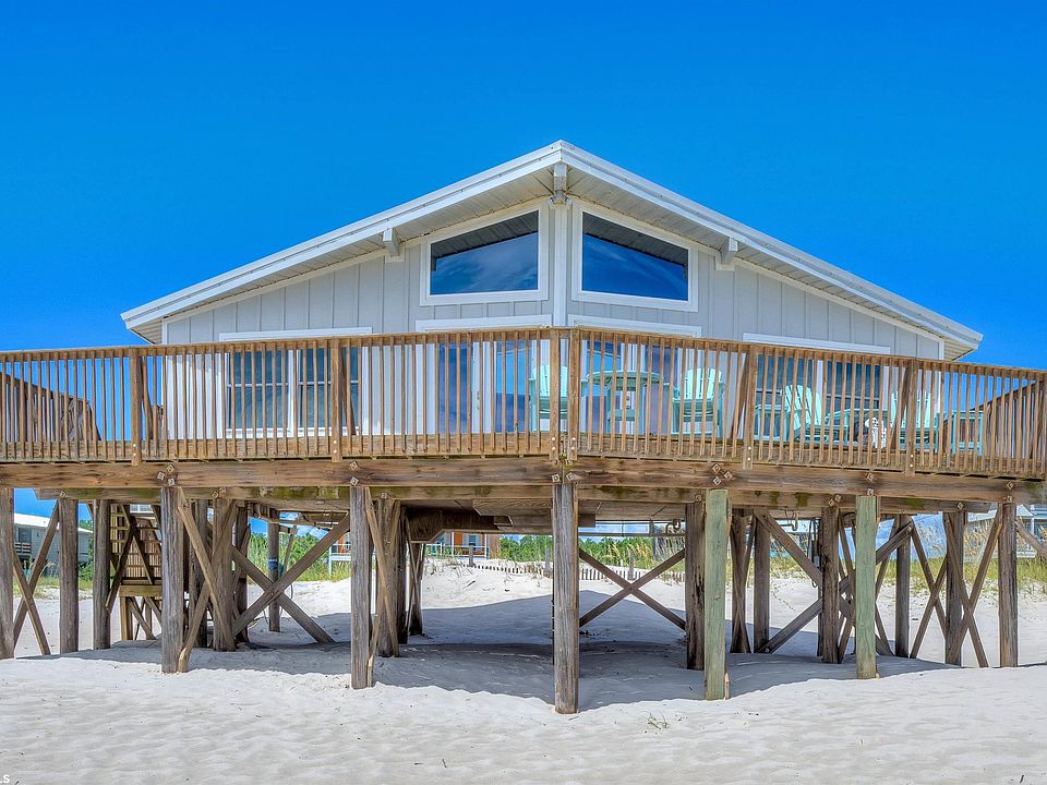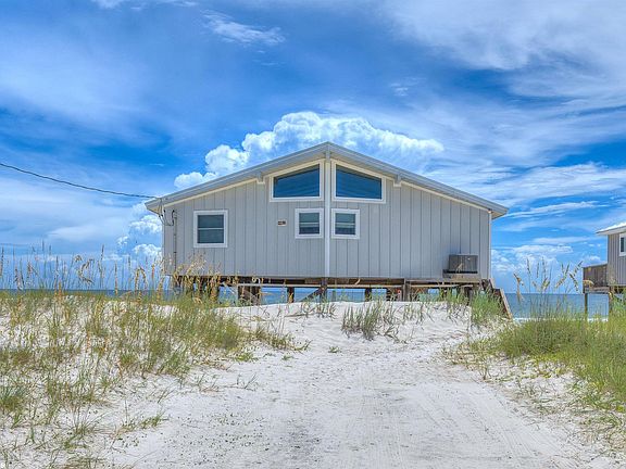 THIS ONE IS PRICED TO SELL!!! - RENOVATED GULF FRONT HOME! This could be your dream beach house with established rental income. New metal roof 2019, High Impact windows with lifetime warranty, New HVAC & ductwork 2021, New siding 2021, New carpet 2021, New refrigerator 2021, New range 2021, New patio furniture 2021, New underpinning with new hurricane straps & bolts. Open Living/Dining/Kitchen with vaulted ceiling and floor to ceiling windows. Large kitchen with plenty of space and Island has eating bar. Two gulf front bedrooms with direct gulf views and one north side guest bedroom. Wide deck has fabulous views of sunrise and sunset and lots of space to enjoy. Deck has safety gate to block stairs. Conveniently located near World Class Golf, Marina, Charter Fishing, Restaurants, Ferry and Historic Fort Morgan.