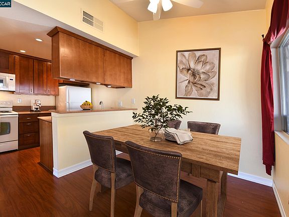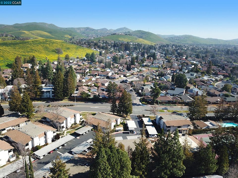 Open Sat 1-4, Sun 11-2pm. Great upper end unit with plenty of natural light & views of Mount Diablo & the hills. Updated kitchen w/ quartz counters, solid wood cabinets, recessed lighting & glass etched pantry door. Kitchen overlooks dining area which boasts high ceilings & new remote controlled ceiling fan. The spacious living room has laminate flooring, gas fireplace, is pre-wired for surround sound & offers access to the inviting patio. Oversized primary bedroom has walk-in closet & vanity w/ sink. BR 2 offers large wardrobe closet. Both BR have new window blinds & nice views. Bathroom features new vanity & new shower doors. Central heat/air. Ideal location near shops, schools, parks, commuter roads. Covered parking right out front. Assigned uncover space too. Plenty of interior storage + private exterior storage closet steps from unit. Desirable community offers swimming pools, tennis/sport courts. Low HOA dues include water, sewer & garbage.