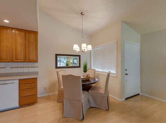 Super cute end unit close to pool & tennis courts; Light, bright & open floor plan w/ vaulted ceiling in living room; Gas fireplace; Private balcony; Views of trees from almost every window. Laminate flooring; Large walk in closet; Fresh paint; Close to shops, restaurants & amenities! Open Sat/Sun 1-4