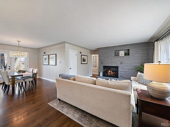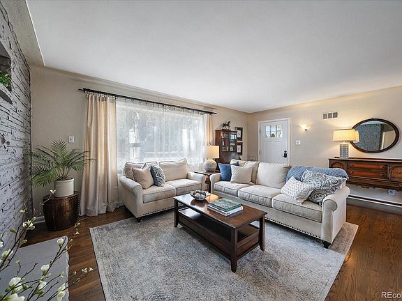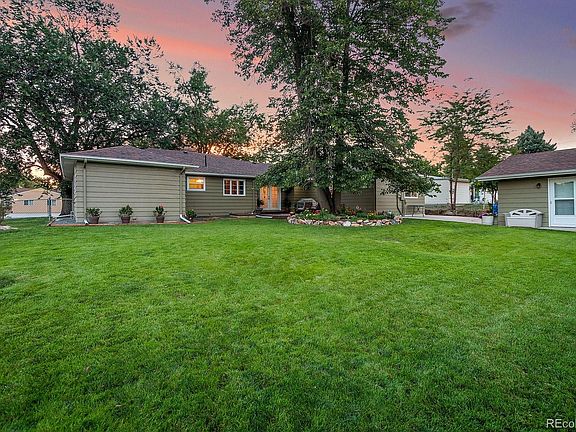 Sprawling ranch-style home just west of Olde Town where rare one level living is a reality! Situated on an expansive 1/3-acre lot, the property includes ditch water rights, ensuring cost-effective watering and a beautiful yard year-round. The home features awe-inspiring curb appeal with a lush lawn, mature trees, perennials, and a picture-perfect, large covered front porch. Inside, the welcoming, open floor plan is perfect for hosting gatherings, both large and small. The home opens to cozy living and dining rooms with coved ceilings and a built-in wood burning stone fireplace capturing the warmth of 1950’s architecture. The spacious, refreshed kitchen includes slab granite counters, sleek painted cabinetry, updated hardware, stainless steel appliances, a large island, open shelving and abundant storage space. The great room includes an oversized family room with an open desk/den space with a surplus of storage for stowing everything from office supplies and books to crafts, toys and games. The home offers 4 generously sized bedrooms, including a master suite with dual walk-in closets and a sumptuously remodeled 4-piece bath with heated floors, 2-piece shower and a built-in laundry area with folding area and storage. Two secondary bedrooms share a fully updated full hall bath, while a fourth bedroom in the north wing is a perfect guest room or home office. Beautifully refinished hardwood floors, new interior and exterior paint and updated light fixtures throughout add to the home's nods to both charm and luxury. Quiet rear patio, set under mature shade trees overlooking the large, lush lot with a fenced off garden area and loads of privacy. Oversized detached two-car garage is heated and has an EV 220v charging hook-up. Two additional gardening sheds provide ample storage. Furnace and A/C were installed in 2023 (A/C is refurbished). Located just over a mile from the heart of historic Downtown Arvada's shopping, dining, retail, wineries, breweries and entertainment.
