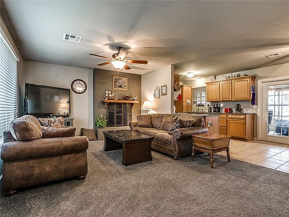 Talk about convenience! This updated ranch home sits on 1 acre mol with highway frontage just 2 miles east of I-35. Updates like the metal roof, vinyl windows and composite stockade fencing are evident before you ever make it inside. Once inside you will appreciate the neutral greige paint scheme, recently replaced carpeting throughout and granite counters. A gas fireplace adds warmth to the open living area and an all season sunroom provides for a 2nd living area that leads to a large covered patio. (The heat/air unit is brand new in the sunroom) All the bedrooms are very generous in size with two masters having en suite bathrooms. The spacious backyard is enclosed with composite stockade fencing offering an added measure of privacy and security. Numerous trees adorn this one acre property which is fenced so that a couple head of livestock are possible as well. The metal storage building in the pasture will stay with the property. Plenty of room for a garden or just room to play!