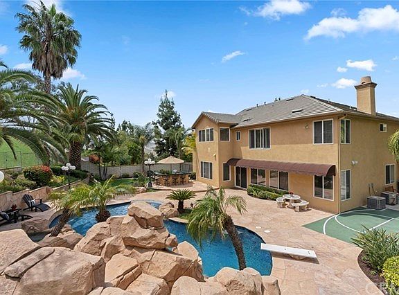 Just Reduced!! Pride to sell!!EXCEPTIONAL OUTDOOR ENTERTAINING!!! Paradise in your own private resort all year long!! Impeccable grounds with amazing curb appeal. Enter into an entry with curved staircase & a turret rotunda. Marble flooring and grand 2 story ceilings greet you. Formal living and dining areas w/warming fireplace & lots of windows, bring in natural light. Huge wrap around peninsula in the kitchen with a large sunny breakfast nook open up to a expansive great room. Raised hearth, & brick fireplace accent the built-in entertainment center. En-suite bedroom, laundry & powder room complete the lower level. The custom iron staircase leads to the upper level. Upstairs boasts a custom pub bonus room with plenty of room for entertaining family, friends, & enjoying a great game of pool. Double entry doors lead into sumptuous master suite, boasting glass block shower, Jacuzzi tub, double vanities, & generous walk-in closet. Three additional upstairs bedrooms & two full bathrooms complete the upstairs. Outdoor entertaining begins with splashing away in an INCREDIBLE Rock formation Pebble Tec pool, & elevated spa with cascading waterfalls & slide. Steps lead up to a lookout Gazebo allowing picturesque views. Built-in BBQ with plenty of seating, a private sports court & large grassy area complete this amazing backyard.Built-ins throughout, plantation shutters, & fabulous floorplan complete the package on this remarkable home. 4 car garage & Yorba Linda High School boundary