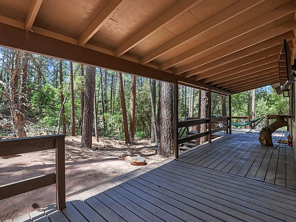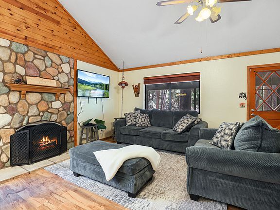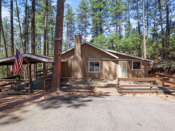 This well-maintained cozy cabin sits on 1.23 acres nestled amongst tall Ponderosa pines. Cabin offers 3 bedrooms, 2 bathrooms with 1042sf of living space. Wood Buring fireplace, beautiful vinyl wood flooring, newer appliances and split system heating and cooling. Kitchen has electric range, refrigerator and dishwasher with ample cabinets. Master bedroom has door leading to open deck. Shower, and washer & dryer in master bathroom. Two additional bedrooms and a full bathroom round out this nice home. Outdoor living is truly special with oversized covered deck and two open decks. Large firepit and lodgepole swing to enjoy nature. New roof in June 2023. Home is being sold fully furnished! Shed on property and asphalt driveway added in 2021. There is an HOA.