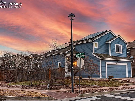 Step into a beautifully updated home where elegance meets modern convenience. This gem boasts custom interior paint, an exquisite entertainment nook with Granite counter, beautifully tiled backsplash, and stunning stone accents to the ceiling. Marvel at the dining area and kitchen's amazing custom-tiled flooring, complemented by a sleek new vinyl sliding glass door with built-in mini blinds. The kitchen cabinets professionally painted radiate a fresh contemporary vibe. All bathrooms have been thoughtfully updated, with the master bathroom featuring an indulgent spa shower and an expansive walk-in closet, this bedroom has an open feeling with vaulted ceilings. This home offers central A/C to keep cool on those hot Colorado summer days, and SOLAR PANELS to take advantage of all that Southern exposure, ensuring comfort and energy efficiency for the new home owner. Backyard has a storage shed for your outdoor gardening and landscaping tools, and tons of potential to make this your dream backyard. This U.S. Homes Corp, Built this premium home on large corner lot. A 3rd Parking Spot can be made if needed on the space to the right of the driveway, The open floor plan, enhanced by vaulted ceilings, creates a grand, airy atmosphere. Ideally located across the street from a grade school, park, and walking trails, QUICK access to Powers Blvd at Stetson Hills, providing you an easy commute to the Airport or Military Bases and to I-25 North for Denver Commuters. In the area there are a plethora of dining, entertainment, shopping, and medical facilities. Unleash your imagination in the full basement—whether you envision a home theater, gym, or an extra living space, the possibilities are endless. This home isn’t just a living space; it’s a lifestyle waiting to be embraced.