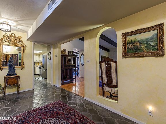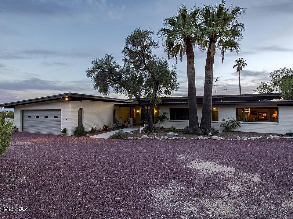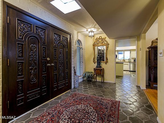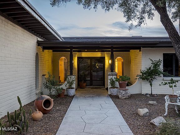 With only 2 owners, this David Fraker architectural home was built in 1970 and is located in the coveted gated Skyline Country Club Estates. The home sits on an elevated lot providing a panoramic view of Tucson's mountain ranges and the Coronado National Forest. The long private drive leads you away from the main road to your home. The foyer's grand entrance invites you in through the wooden double doors. The large living room with exposed wooden beams, high ceilings and wood burning fireplace offer sensational city views. Off the large kitchen you will find double pantry closets giving much needed space for all your gadgets. The formal dining room offers space for large family gatherings, overlooks the Olympic size-like pool and natural desert. The two separate patios, allow you to welcome each day with a cup of coffee and watch the sunrises on the East and unwind and relax while you watch the sunsets on the South. The laundry room and garage are both spacious and offer plenty of storage space. In the Primary bedroom, the large double doors invite you to the outdoor patio, the ensuite has a gorgeous walk-in shower and jetted tub while the walk-in closet provides ample space and storage. A guest suite with full bath and private entrance is separated by the laundry room to the main house. The other 2 bedrooms offer ample space with good-sized closets. The guest bathroom is the perfect size for guests. The privacy, views, location and space are exceptional, now add your style and touch to make it your own. Please see mattorport for additional insight of this magnificent property.