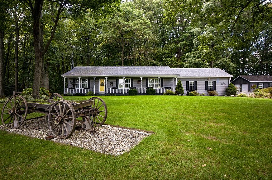 Beautiful and peaceful single story home on 2 acres. One owner home has been very well cared for over the years. 3 bedrooms and 1.5 baths with large open kitchen and eat in dining room as well as breakfast counter. Basement is unfinished but has complete nova water proof system. Large deck on back of home and beautiful covered front porch. Large pole building with water, 220 electric outlet and concrete floors. Additional shed for storage. Seller has generator outlet in garage.