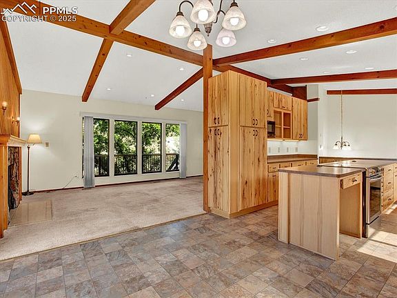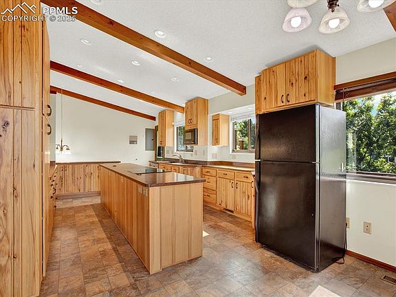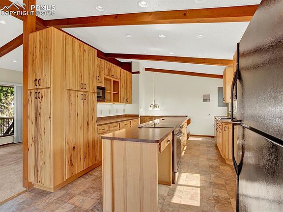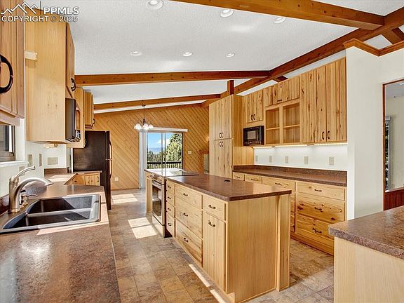 Welcome to this beautifully maintained raised rancher, ideally situated on a spacious 0.6± acre lot in the heart of Colorado Springs! This home features 4 bedrooms and 3 bathrooms, with 2 of the upper-level bedrooms boasting walk-in closets on the main level with new carpet. The oversized kitchen is a chef’s dream with hickory cabinets, under cabinet lighting, a 12-ft center island, and two built-in microwaves. Enjoy the warmth and character of wood accents throughout, cathedral ceilings in the living room and kitchen, and a striking barn wood surround on the upstairs fireplace. A second wood-burning fireplace is located on the lower level, creating cozy spaces on both floors. You'll appreciate thoughtful upgrades like recessed lighting, central air conditioning, gas forced-air heating, an electric water heater, and two sets of washers and dryers—one in the primary bedroom and another in the dedicated laundry room with deep sink. This centrally located gem offers unbeatable access to shopping, dining, recreation, medical facilities, contractors, churches, and schools—everything you need is just minutes away. Plus, Flintridge is one of the first city streets to receive snow removal in winter for added convenience. Outside, relax on composite decking that wraps around three sides of the upper level, soak in Pikes Peak views from the front deck, or enjoy a soak in the hot tub next to the chiminea on the back deck. The large lot features mature trees, an oversized 2-car garage, a concrete RV parking pad, impact resistant 40yr warranty roof and drive-around access through a 10-ft truck gate. The backyard is fully fenced and includes an additional gate in front. With no HOA, great curb appeal including stone accents, and just a short walk to nearby schools and Keller Park, this home offers the perfect mix of space, comfort, and location. Don’t miss this rare opportunity—schedule your showing today!