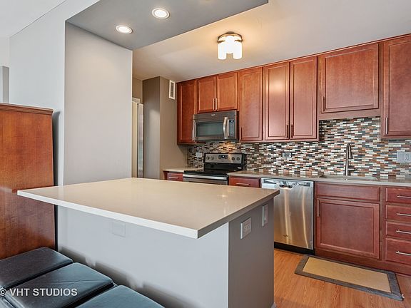 Beautiful Updated South Facing oversized 1 bed 1 bath! This bright unit has many updates throughout this open floor plan. Gorgeous eat in kitchen with 42 in wood cabs, tile backsplash, quartz countertops, ss appliances, new flooring in entryway and kitchen and newly painted! Updated bath with newer vanity, marble throughout, new fixtures! Steps to the Lake, Andersonville, public transportation, Mariano's! Full Amenity building w 24 door person and maintenance, Roof deck, party room, dog run, pool and cabanas, dry cleaner on site and valet parking available! Great closest and storage!