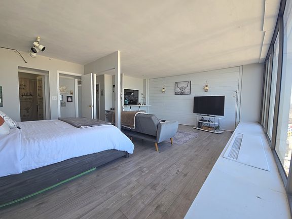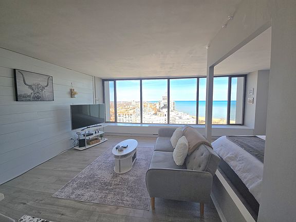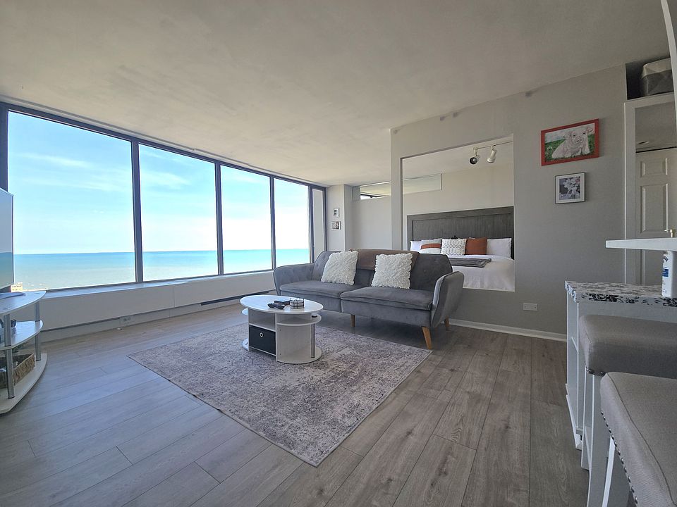 Rare boutique condo w/ Floor to ceiling view of the lake! This is an enormous converible studio in Bryn Mawr district of Andersonville/Edgewater. All utilities ( internet, cable water, heat, air, garbage, pool, 24 hr doorman and maintenance) included except plug-ins. Appointed with premium King bed, new sofa. coffee table, large flat screen TV, Keurig, all cookware, etc; Every detail has been carefully chosen; Fully furnished. The train and express buses are right outside! Mariano's, Jewel, cafes, every type of cuisine and convenience. Did I mention the 24 hr doorstaff, maintenance, and full- amenity building?You have to see this! Call or text Rachel Owner pays for gas, water, internet, cable, heat.