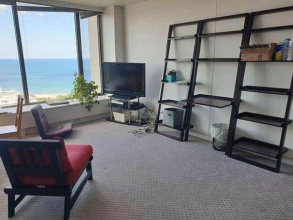 FURNISHED & LOVELY Studio apartment with AMAZING lake and city views. Full wall of windows facing north & east. Walk to FOSTER & HOLLYWOOD beaches. Large closets with plenty of storage. One of the best buildings on Sheridan, this one has more amenities than you can imagine! Highlights: 24 hour door person, roof deck, onsite manager, 2 party rooms, back yard/gas grills, with gate that opens up to the park and bike path. Outdoor pool and cabana available to residents too. Bryn Mawr and Berwyn Red Line stops within 5-7 minute walk, 147 bus direct to downtown stops out front! Also, walking distance to Mariano's and many restaurants! Onsite cleaners, Heated garage/valet parking monthly $175.00. Move-in non-refundable fee of $350.00, and, move-out fee for $100.00. There is also a refundable damage deposit of $500.00.