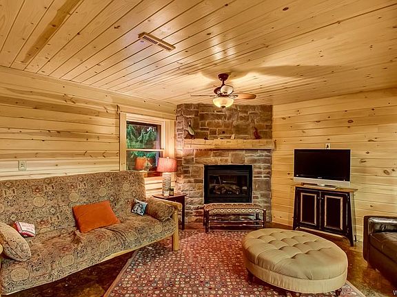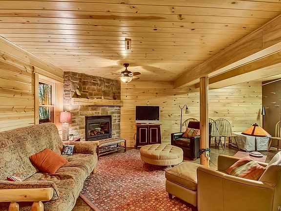 This log built chalet come fully loaded & ready for you to make it your Ellicottville area investment. Well maintained inside & out. Front & back decks & hot tub for relaxing. Step inside & you will be astounded at what this chalet is all about. Beautiful wood floors , lower level family room w/ fireplace, bedroom & its own bathroom. Step up to the cathedral ceiling great room that opens to the smart designed kitchen & dining area. More bedrooms & bath on this floor. Up to the spacious loft & private master suite. So many upgrades, furnished & al on 5+ acres right next to NYS land for hiking & all outdoor adventures right at your back door