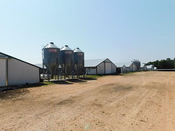 54 Acre Poultry Farm, Home & Shop - currently operating, 6- 40 x 400 ft broiler houses, automated with Provision computers, cool cells, 8-48'' fans & 1-52'' fan per house, 135 KW John Deere Generator, 300 gallon fuel tank, 3 wells, well house, Agri Alert automatic phone dialer, 2 Choretime feed lines & 4 water lines per house, 9-28K lb feed bins, 6-1000 and 1-500 gal propane tanks, 40 x 60 ft stacking shed, 18 x 80 ft 8 bin compost shed with concrete stem wall, approx 10 acres pasture, 2 ponds, couple old wood buildings, deer & turkey, 30 x 50 ft metal shop building with apartment, 28 x 48 ft 1997 manufactured home needs repairs and TLC. Poultry houses new in 1996 fully updated, owner has new 7 year Tyson contract in spring 2022, buyer must qualify with Tyson. Aerial map in Documents.
