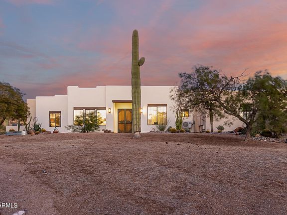 Embrace the serenity and beauty of this 5-acre desert property! Find yourself amidst stunning mountain panoramas of the Goldfields and Superstitions. Chase your gold rush dreams and find explore the many crystal veins along the property or hit up the Greevers Needle Trail head just steps away from the property line. This lush retreat has a sparkling infinity edge pool and spa, a large oversized covered patio allowing you to fully embrace life outdoors. The interior is just as stunning. Walk in through the oversized pine doors to be greeted with a modern Santa Fe motif with custom finishes, expansive tile floors, neutral paint, and soaring ceilings are complemented by mountain views from every window. The chef's kitchen, oversized bedrooms, formal living & dining areas are a must see. Enjoy majestic sunsets in the vast backyard, featuring a covered patio with Saltillo tiles, a luxurious spa, a refreshing pool, and captivating city-light views to enchant your evenings. This gem is an incredible find! Make it yours!
