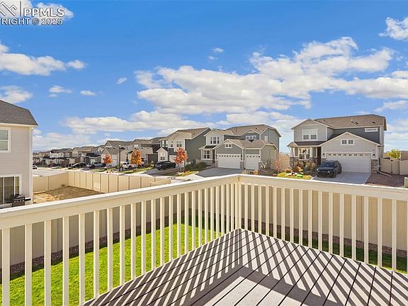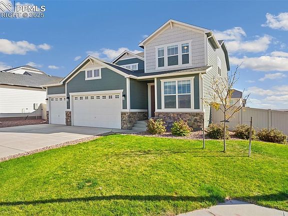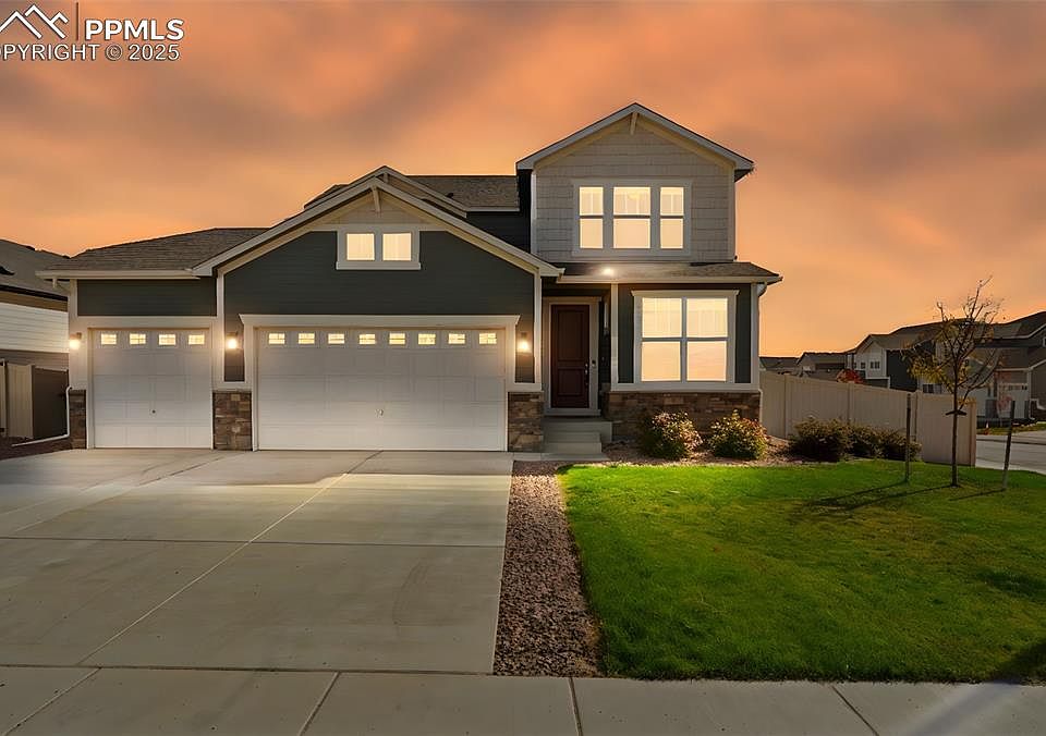 Why wait for a new? This home is Better than new! This stunning 5-bedroom, 4-bath home offers 3,377 sq. ft. is a beautifully designed living space and is the only 3-car garage with gorgeous views of Pikes Peak and the front range views. The only 3 car garage for sale in the neighborhood. Step inside to find a bright, open-concept floor plan that effortlessly blends comfort and functionality. The main level features a versatile room can be used as an office/bedroom and a convenient pocket office just off the entryway—perfect for remote work or study. The spacious living room has an abundance of natural light, creating a warm and inviting atmosphere. Designed for everyday living and entertaining, the exceptional kitchen includes a big center island with seating, quartz countertops, stainless steel appliances, and a large walk-in pantry with custom cabinetry. There is also a main level bedroom, this home has it all. Upstairs, the primary suite features a luxurious en-suite bath with dual vanities, a glass-enclosed shower, and a built-in makeup vanity. Three additional bedrooms, a full bath, laundry, and an oversized loft complete the upper level—ideal for a playroom, media area, or home gym. The fully finished basement provides a fantastic space for entertaining with a large family room, additional bedroom, full bathroom, and ample storage. Outside, enjoy the fully landscaped and fenced backyard. Additional highlights include central A/C, a tankless water heater, Curtains and blinds and a 3-car garage offering plenty of storage. Conveniently located near Fort Carson, Schriever SFB, and Peterson SFB, with no HOA. Don’t miss the opportunity to make this exceptional property your new home!