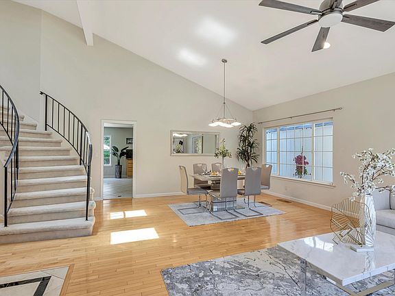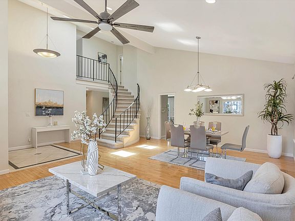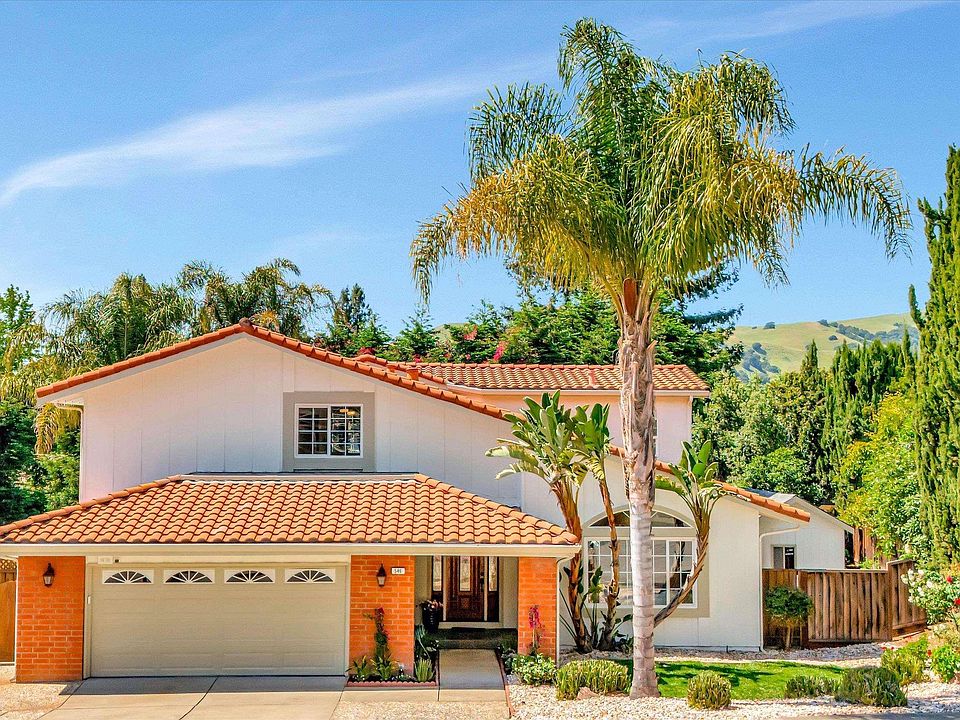 Welcome to this stunning mediterranean style villa nestled in a serene cul-de-sac in the beautiful hills of Fremont, ranked as the happiest city in the nation for a consecutive 5 years! The happiness continues in this gorgeous 4 bedroom, 3 bathroom home with dramatic rounded staircase, high ceilings, gleaming hardwood floors and stunning open floor plan in a charming, quiet neighborhood. There is an abundance of natural light streaming through the skylights creating a bright and airy living space. The heart of the home is the gourmet kitchen, complete with stainless steel appliances, granite countertops and cabinets galore with a beautiful island and breakfast bar. Upstairs, you'll find the luxurious and spacious primary suite offering a peaceful retreat area with an ensuite bathroom and generous walk-in closet along with stunning balcony overlooking the lush tropical backyard that will take your breath away! The main floor bedroom and full bath is perfect for family and guests. Living Room and formal dining room seamlessly connect for entertaining. Family room opens to kitchen so conversations flow as memories are made. Backyard is a tropical oasis with custom white swing amongst the purple bougainvilla. Amazing location with award winning schools!