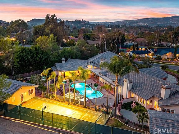 Experience the pinnacle of luxury living in this exceptional grand estate situated in the esteemed Lazy Creek Country Estates of Orange Park Acres. This home is a true masterpiece meticulously maintained. Featuring an impressive 8,400 s.f. of living space in the main house, this residence exemplifies elegance and functionality. Every aspect of this home exudes refinement, from the 5 bedrooms to the versatile craft room that can be easily transformed into another bedroom. The residence includes an executive office/library, extra office space, a junior suite with 3 bedrooms and 2 bathrooms, and a primary retreat with a sitting area and fireplace. A sauna and workout room are available for relaxation and fitness. The expansive primary bathroom highlights a sunken tub, steam shower, and marble floors, while the chef's kitchen boasts high-end appliances and solid walnut cabinetry. The family room's dual-faced stacked stone fireplace invites relaxation, while the dedicated entertainment area boasts a card game room, full bar, walk-in wine closet, and billiards room perfect for hosting memorable gatherings. Imagine retreating to a private theater room with raised seating for 12 that is perfect for unforgettable movie nights. The California Room offers indoor-outdoor living with its full kitchen, 16' retractable doors, and seamless flow to the stunning backyard oasis. Here, you'll discover a resort-style paradise complete with privacy, lush landscaping, brick pavers, a sparkling pool, swim-up bar, and jacuzzi. In addition to the lovely pool area you can also enjoy basketball, paddle tennis or pickleball on your own private lighted court. Guests will appreciate the separate guest house (approx. 1,033 s.f.), complete with 2 beds, 2 baths, and a covered porch offering views of the expansive backyard. With its 4 car attached garage and separate RV garage, this property can provide indoor parking for up to 10 cars or a mix of cars, RV’s, and recreational toys! The opportunities are endless at this dream home on Wildhorse!
