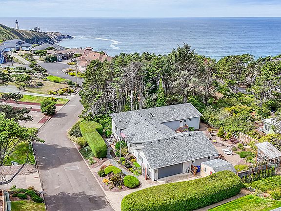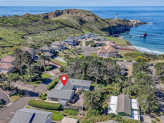 Just a few hundred yards from breathtaking views of Newport's iconic Yaquina Head Lighthouse and the Pacific Ocean, and moments from beach access, this beautifully updated Agate Beach home offers the ultimate coastal lifestyle, unforgettable sunsets, the soothing sound of the surf, and close proximity to nature. Inside, the home features three true bedrooms, two full baths, and a versatile den that serves as a cozy retreat with a wet bar, mini fridge, and space ideal for a home office. Vaulted ceilings with skylights and engineered hardwood floors throughout the main living areas create a light-filled, airy ambiance. The kitchen has been fully renovated with quartz countertops, hand-glazed Italian subway tile backsplash, a deep basin sink, and new stainless appliances including a gas stove, refrigerator, dishwasher, microwave, and garbage disposal. The primary suite opens onto a new private deck and a beautifully re-landscaped backyard with raised garden beds, a custom-built greenhouse, and a matching shed. Additional upgrades include a central vacuum system, crystal doorknobs, designer lighting, west-facing full-view shades, and privacy shutters at the rear of the property. The newly roofed home includes an addition with a second backyard access point. The garage offers a sink, built-in storage, a workbench, and keypad entry. Energy-efficient LED canister lighting and app-controlled Enbrighten eave lights add both style and function. Located in a nice neighborhood with underground utilities and clear star-filled skies, this Agate Beach retreat blends comfort, quality, and proximity to nature with regular visits from hummingbirds, eagles, deer, and the occasional blue heron. A rare opportunity to own a peaceful, coastal oasis just minutes from all that Newport has to offer.