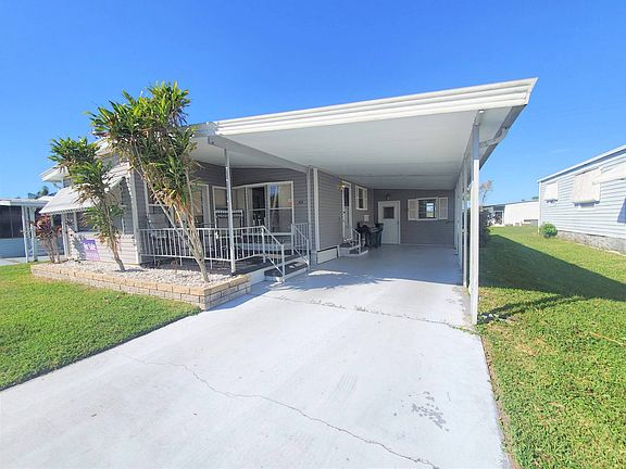 Just Listed $47,900 Turnkey This 1975 manufactured home features 2 bedrooms and 2 bathrooms. This home is coming fully furnished and turnkey. It is priced to sell and does need some TLC. The L-shaped kitchen has plenty of cabinet space and a nice sized pantry. Dining area and living room are open to one another. The living room does have 2 soft spots. The front enclosed lanai is air-conditioned and is a perfect year-round room. The exterior door leads out to the covered front patio. Guest bedroom and bathroom are both roomy. The bathroom has a step-in shower with a sliding glass door. Large master bedroom with 4 closets, built-in dresser and an ensuite bathroom. The roof is Metal. New tankless water tank. The storage shed is huge with a utility sink and a washer and dryer hookup. Call today to make this your Florida Dream home! Colony Cove is an age qualified (55+) five-star resort community of manufactured/mobile homes. The "Cove" boasts 5 clubhouses, 6 heated pools, a riverfront pavilion and private fishing pier, a private marina, a fenced dog park (very pet friendly), tennis, shuffleboard, new pickleball courts, 2 new fitness rooms, 24-hour patrol, clubs of every interest, and much more. There are daily planned activities throughout the park. Bottom line, if you get bored here, it's your own fault! The lot rent in Colony Cove is based on the home's location. While the monthly lot rent may not be the lowest around, it's by far the best value for the money. Not only does the monthly rent cover all of the amenities of the community listed above, it also covers almost all other monthly expenses such as water, sewer, trash pickup. All property taxes, lawn maintenance...pretty much every monthly expense except electricity and internet. The current lot rent on this home is estimated at $894.81 per month. All listing information given to us is considered appropriate and reliable but always recommend home inspections by independent companies who have a background and thorough understanding of manufactured homes. We cannot guarantee the accuracy of information given to us or the condition of the home. Lot rents are determined by the community office not our company.