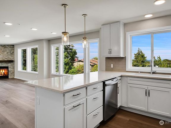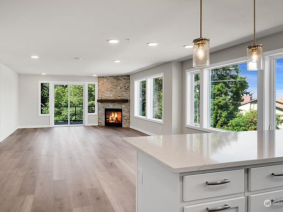Live at coveted Paradise Heights Edmonds' newest luxury condos. This 2-bed unit has peekaboo views of Sound & Mt. Baker. Spacious 437 SF private garage w/ direct elevator access to unit. Open-concept design enhances natural light & huge windows. Sleek corner travertine gas fireplace adds warmth & style. Step out to the private deck, w/ modern glass panels. Chef’s kitchen features a breakfast bar, easily seats four & SS GE Profile appliances. Custom cabinetry, carrara misty quartz countertops, & under-cabinet lighting. Heat pump mini splits ensure year-round comfort. Wide-plank LVP flooring throughout the main. Primary Suite offers a spacious bath w/ dual sinks, walk-in shower, & oversized walk-in closet w/ built-ins. 2nd bed w/ WIC.