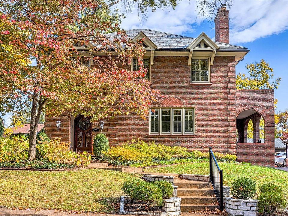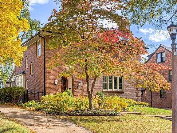 Stunning updated English style home with 9' ceilings, natural woodwork, and hardwood floors throughout. Enter to find an impressive entry with a fabulous front door, a spacious living room with gorgeous stained glass, leaded glass windows and doors, and a fireplace with a stainless steel flue liner. Continue on to the lovely dining room with an outside door to a charming side porch and a large eat-in kitchen with a center island, sub-zero refrigerator, wall oven, and gas cooktop. Completing the first floor is a sweet half bath. Upstairs, you will find three bedrooms and two baths. One oversized bedroom was originally two bedrooms that can possibly be returned to that formation. The primary bedroom with bath en-suite is generous in size and includes a door to a covered porch. Finally, there is a guest bedroom and hall bath. Outside provides a partially fenced backyard, a detached garage, and pretty plantings all around. Includes a sprinkler system.