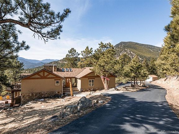 Panoramic views and custom woodwork just begin to describe this quality craftsman style stone and stucco home. Upon entering you are captivated by the views of Mt Rosalie from the floor to ceiling windows of the great room which is highlighted by the hardwood floors and a fireplace that has been enhanced with a Vermont Castings insert for comfort, efficiency and ambiance. Granite counter tops, cherry cabinets, island bar seating, cook top, refrigerator, wall oven, microwave, pantry and built-in breakfast nook complete the chef's kitchen. Formal dining area with room for a china cabinet also offers easy access to the viewing deck. The views flow to the spacious main floor master with sitting area and walk-in closet. Granite countertop, large soak tub, tiled walk-in shower, water closet, and radiant in-floor heat finishes the 5 pc. master bathroom. The en-suite guest bedroom completes the main floor living. The lower-level with walk-out access includes the family room, guest bedroom/craft room, laundry room with adjacent guest bathroom with shower and a forth spacious guest bedroom presently used as an office with custom built-in bookcase and windows that frame the meadow and mountain views. The exterior patio houses the private hot tub and is within a few steps from the coveted fire pit, a favorite evening gathering spot. A gentle sloping meadow covering over 2 acres provides room to play, garden or watch the Colorado wildlife as they make their way across the terrain. Attached two car over-sized garage with workbench is complimented by a stand-alone storage shed with garage door for your mountain toys. Paved driveway allows space for RV parking. Boiler and roof replaced in 2015, complete remodel. Don't miss out, book your showing today!