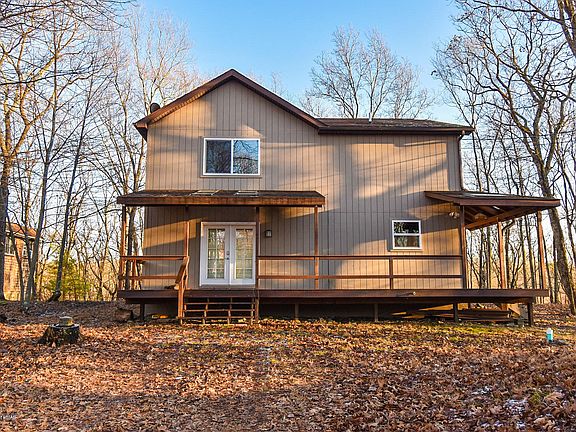 BEAUTIFULLY REDESIGNED 3BR/2BA saltbox style filled w/ UPDATES! The layout of this home is perfect for entertaining guests. A modern Kitchen w/ stunning finishes offers stainless steel appliances & a stone backsplash flowing right into the Dining Room w/ French doors to the LARGE wrap around deck & a double-sided fireplace that can be seen in both the Dining & Living Room. The Living Room is flooded w/ natural light making the space cozy & inviting. 2 sliders access the back deck w/ amazing nature views. The main level has radiant flooring including the 1st floor Master. The 2nd floor features the spacious loft, 2 NICE SIZE bedrooms w/ big closets. This home also has a gas tankless water heater & has VERY LOW taxes in gated community minutes away from Bushkill Falls, hiking, & skiing!