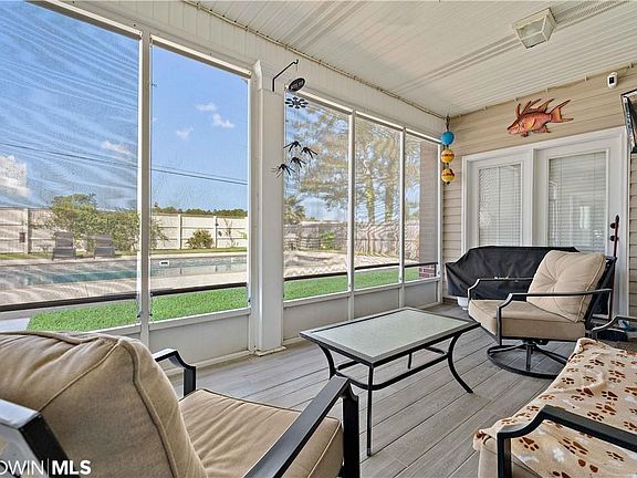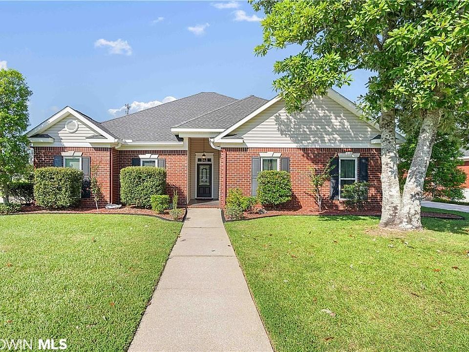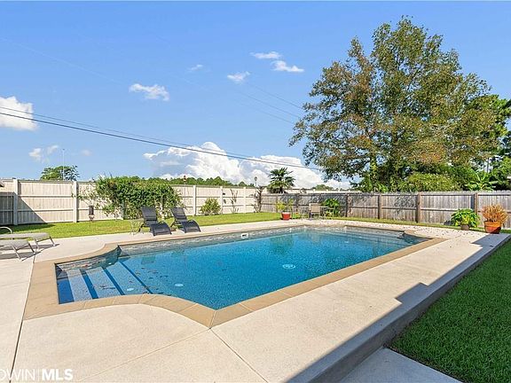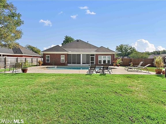 Welcome to your dream home! This stunning, custom-built property offers a seamless blend of comfort & convenience. Located with easy access to the interstate, this home boasts an open floor plan, smooth ceilings, upgraded windows, new gutters and a roof less than 2 years old. As you step inside, you'll be greeted by a spacious super-sized den featuring exquisite bamboo hardwood floors, a vaulted ceiling, a cozy gas fireplace, creating the perfect ambiance for relaxation. The kitchen is a culinary masterpiece, adorned with ample granite counter space, beautifully painted cabinets, a charming island, all tastefully updated. The breakfast bar comfortably seats up to six people, there's also room for a separate dining table, making it ideal for gatherings. Stainless steel appliances includes a double oven and ice maker, ensuring a modern and efficient cooking experience. The primary bdrm is a retreat in itself and offers access to the serene screened in porch. The spacious primary bath boasts a double vanity, a separate shower, two walk in closets, private water closet, a luxurious jetted tub, a true oasis of relaxation. When seated in the 20x10 enclosed porch, unwind while enjoying the view of the beautiful water features into the pool. The back porch is wired for speakers, making it an ideal spot for relaxation. The sports pool has a brand new liner and has cantilever umbrellas for days you want less sun exposure. The Paramount cleaning system allows all the luxury of a pool with zero time or effort keeping the pool clean. The yards are beautifully landscaped on this big corner lot and fully fenced for privacy. An add'l slab with electricity is perfect for RV or boat storage. Convenient 1/2 bath near the side-entry garage adds to the practicality. The location allows you to reach downtown Mobile in less than 15 minutes via Interstate 10, this home is perfectly situated for both convenience and tranquility. Updates per seller. Buyer to verify Square Footage.