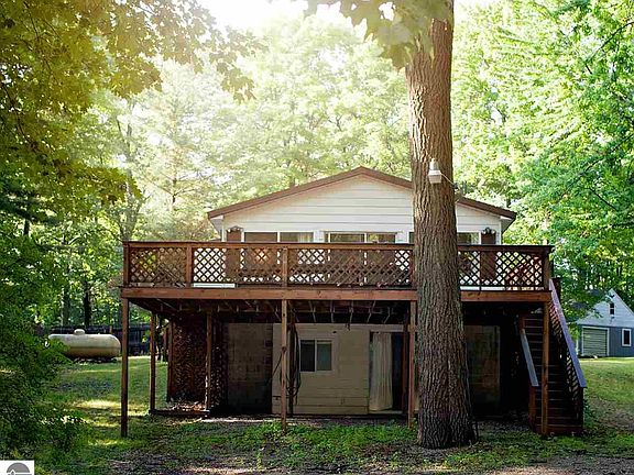 Nice home on beautiful lots with great view of Bear Lake and access right across the street. Large kitchen dining area as well as a very large living area with plenty of natural light and door walls leading to good sized deck. 2 bedrooms, one bath, partial basement with laundry, new septic, metal roof, pellet stove, and a large garage/pole barn. Very close to thousands of acres of Huron National Forest Land. Trails close by. Just a nice place to be!!!
