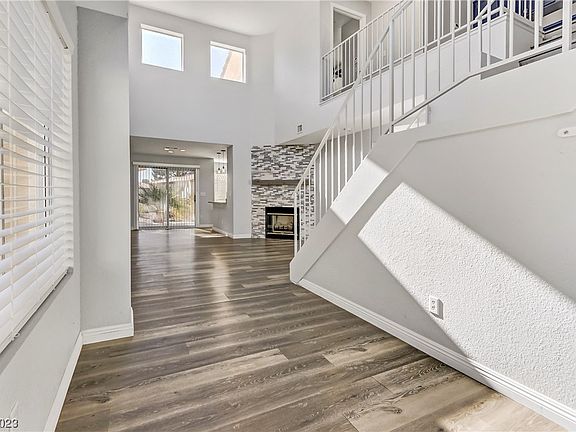 Wow! Amazing opportunity to live in Guard Gated Painted Desert Golf Community. Soaring ceilings flooded with light highlight upgraded Wood Laminate Floors and stunning accent fireplace wall. Open Kitchen with a Harmonious blend of style & functionality invites with pendant lights over breakfast bar, granite counters, cool trendy cabinets & pantry. Newer top of the line SS appliances include gas grill/griddle range/ convection oven & French door refrig w/dual ice makers. Comfy patio area open to lush landscaping. Primary retreat is a harmonious blend of tranquility catering to your relaxation. Convenient ½ bath down & access to 2 car garage. Open staircase allows an expansive unobstructed view leading you up to 2 generous bedrooms 1 with balcony sharing a JnJ bath. HOA includes all landscaping, water, 24 hour roaming security, guard gate, tennis, racquetball, fitness center, pickle ball, clubhouse and more. Easy access to the 95 means you are minutes away from everything Las Vegas!