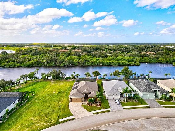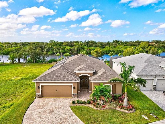 Welcome to the pristine waterfront community of Riverside Point. This gated enclave of 37 homes offers direct access to the Gulf of Mexico via the Braden River. Nestled on a premium homesite, this unique Heron model is truly a one of a kind design offering a 10 ft extension to the open floor plan featuring 4 bedrooms, 3 bathrooms, and a 2 car garage. Built with attention to every detail and premium luxury upgrades throughout this nearly brand new home, you are immediately greeted by a brick paver walkway lined with meticulously maintained lush landscaping that welcomes you to a grand double entrance. 10 foot ceilings with tray accents and crown moldings, paired with custom lighting, glisten on the premium upgraded tile flooring as natural light pours in through plantation shutters on every window. This well appointed kitchen features custom 42 inch adjustable wood cabinetry with hardware and soft close drawers, under cabinet accent lighting, granite counter tops, stainless steel appliance package, stand alone ice maker, walk-in pantry, ample recessed lighting, and a spacious island. The owners suite offers neutral tone carpet, crown moldings, plantations shutters, tray ceilings, a spacious on-suite bath with walk-in closets, double sink vanity, granite counter tops, double toilet closets, and walk-in tiled shower. Bedrooms two and three feature tile flooring, spacious closets, plantation shutters and upgraded ceiling fans. Bedroom four offers a custom built-in desk and cabinetry for flex room option with full size closet, recessed lighting, plantation shutters, and tile flooring to create a seamless and easy transition from bedroom to office. Double French doors lead out to the extended and screened-in brick paver lanai featuring a heated salt water pool with spa. Take a walk down the paver path to your private boat dock with lift and enjoy the beautiful natural views and remarkable Florida sunsets from your own private oasis. Riverside Point is a 40 minute boat ride out to the Gulf of Mexico, located minutes from I-75, a short drive to the award winning beaches, University Town Center Shops & Restaurants.