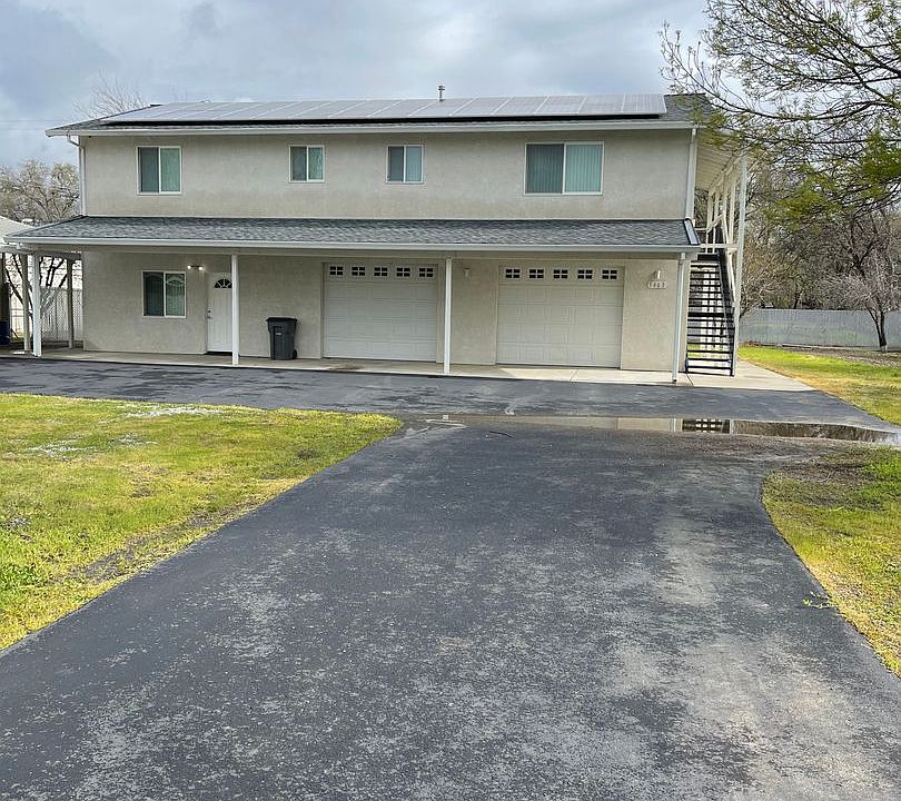 This 3 bedroom 2 bath features a large kitchen with gas range, walk in pantry and lots of counter space. Has a spacious living room with carpet throughout, large laundry room with full size washer and dryer. Central HVAC and tankless water heater for upstairs unit. The attached mother-in-law suite is a 1 bedroom 1 bath with tile flooring and carpet, gas range, microwave and refrigerator. Spacious bathroom with lots of shelving. Wall heater and wall AC unit. Both units have separate garages and a covered carport. Solar panels on the roof. Owner pays water. Landscaping is provided for the large fenced in yard.