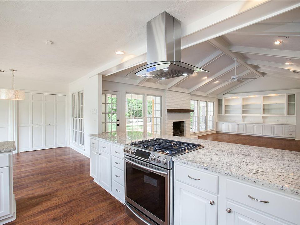 Fabulous and completely renovated home on a wonderful tree-shaded lot. Beautiful 4 bedroom and 2 bath house with a stunning new kitchen with brand new stainless appliances, custom cabinets to the ceiling, granite counters and walk-in pantry. Open floor plan with kitchen opening up to the great room/den with a vaulted ceiling, brick fireplace, beautiful windows and built-ins. Lovely formal living room and dining room. Spacious master suite with a huge walk-in closet and beautiful bathroom with a double vanity, granite counters and gorgeous tile. Three additional large bedrooms with ample closet space. The large hall bathroom has a double vanity and granite counters. Terrific laundry room with lots of storage and a sink. New paint inside and out. No carpet and all new lighting. Two car garage with a bonus space that could easily be converted to a third garage space. Amazing backyard with pretty landscaping, a covered patio and a deck.