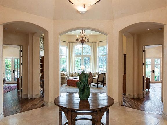 On a 4 acre knoll in the gated community of Quail Meadows, this elegant, single-level home feels spacious, yet manageable. The floor plan flows nicely with French doors leading to the outside from most rooms. The grand entry opens to a sitting room, dining room and living room - tall ceilings and windows take in the mature landscaping and natural light. The gourmet kitchen features a limestone island, a breakfast nook and a pantry. There is also a separate family room with 2 fireplaces. There are 2 guest suites off the entry affording their own privacy with the master suite and sitting room on the eastern side of the home, all with walk-in closets. Above the 3-car garage, sits a beautiful guest house with kitchenette. The home has plenty of storage, including a separate laundry room. The property's quality craftsmanship, vaulted ceilings, walnut hardwood floors, slate roof, idyllic gardens, gorgeous views and convenient location combine to make this a truly special home.