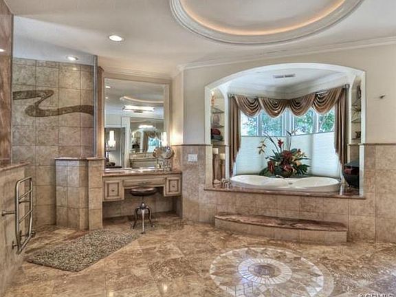 Beautifully customized single story home on a huge usable 30,000+ ft. lot which features a totally self contained fabulous detached guest house, a large fully constructed covered barbeque and entertaing area including built in BBQ with wrap around counters which seat several guest, covered lattice patio areas, a beautiful pool and spa with black bottom pebble tech coating, a generous grassy landscaped portion of the lot and a huge rear portion of the lot dedicated for rv parking with room for multiple toys. The price even includes a current working set of plans for an additional 1000 ft. garage and workshop area. The front of the house has been elaborately hardscaped with a huge and inviting circular driveway, numerous planters, extensive landscaping with lots of scrubs and beautiful palm trees and sensational curb appeal that would impress any passerby. The main house has been totally upgraded with with no expense spared including a massive customized front entry door with etched glass side panels, a remodeled kitchen with beautiful granite tops and extensive cabintry and upgraded appliances, an expanded master bedroom suite with lots of built in cabinetry, a retreat area and a master bath with marble and onyx hard surfaces, heated floors towel warmers.