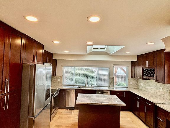 This home has it ALL- Don't miss out on this remarkable home which features 5 good sized bedrooms and 2.5 bathrooms. Plus, an extra smaller unit out back for an office, play/game room, storage, etc. The freshly painted, light and bright home has hardwood floors throughout, mini blinds, vertical blinds and wood slat blinds. There are vaulted ceilings and skylights making for wonderful lighting. The kitchen is fully equipped with all Stainless Steel appliances, including Refrigerator with ice maker and other features, dishwasher, microwave, electric stove and oven, beautiful granite countertops and island. Loads of counter space, beautiful cabinetry and lots of storage. Great dining or family room off kitchen with windows and slider to back and dedicated laundry area complete with washer and dryer included. The living room is large and has a gorgeous fireplace and a slider that leads out to a backyard complete with sparkling pool and hot tub (owner to maintain services), grassy area in front/side, side area with awesome outdoor shower, and another larger side area complete with natural gas BBQ. The primary is stunning with a whole wall of custom closets and storage, decorator lighting and a slider to the back yard. The primary bathroom has modern vanities with ample storage and amazing tile work in the large shower. The home is equipped with Solar Tesla batteries, pool heat pump, EV charging and home security system. Pets are allowed- THIS HOME IS A MUST SEE!