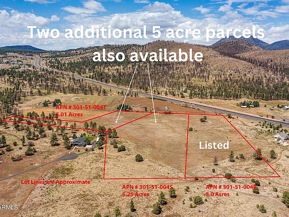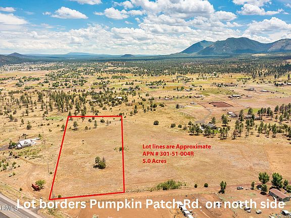 5 acre parcel with panoramic views of the San Francisco Peaks. Land includes easement to the National Forest. Two additional 5 acre parcels available for a total of 15 acres can be purchased (APN #s 30151004S and 30151004T. Parcel 30151004T has panhandle bordering the National Forest). Direct access to lot and available utilities from Pumpkin Patch Rd. Raw land - no utilities currently; buyer responsible for all utilities. Property zoned AR-5 which allows for horses and other animals subject to county zoning ordinances. Taxes will be assessed based on parcel split which Assessor has not completed yet at time of listing. Survey available. Listing agent related to the seller.