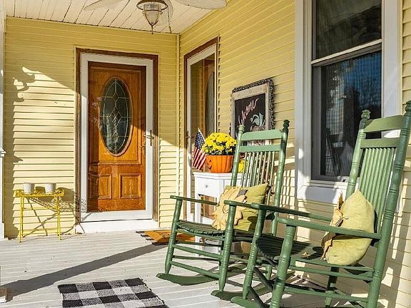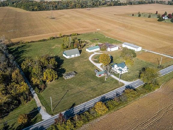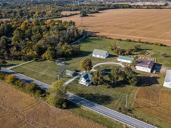 This farm house was gutted and completely rehabbed in 2003. Plumbing, electric, walls, floors, windows, metal roof. Owner has recently done updates that include a new kitchen, bath, laundry room, hot water tank and water softener in 2022. The farmhouse kitchen has lots of cabinets and counter space, SS appliances, and pantry. The formal dining room has a decorative brick fireplace. Master suite is on 1st floor. Laundry first floor. Beautiful hardwood floors throughout main level. Upstairs are 2 large bedrooms, a large loft area and a 2nd full bath. The 5 acre lot has a wooded area with a dry river. There's a 16X30 rustic barn that was built in 1918. Detached garage is 60X28 & has electric and concrete floors. The 61X36 barn has entertainment area located upstairs.