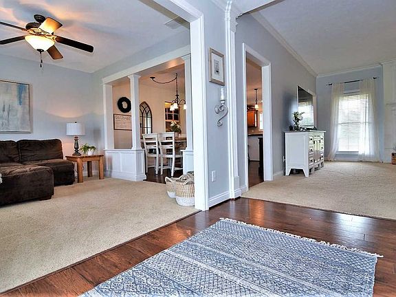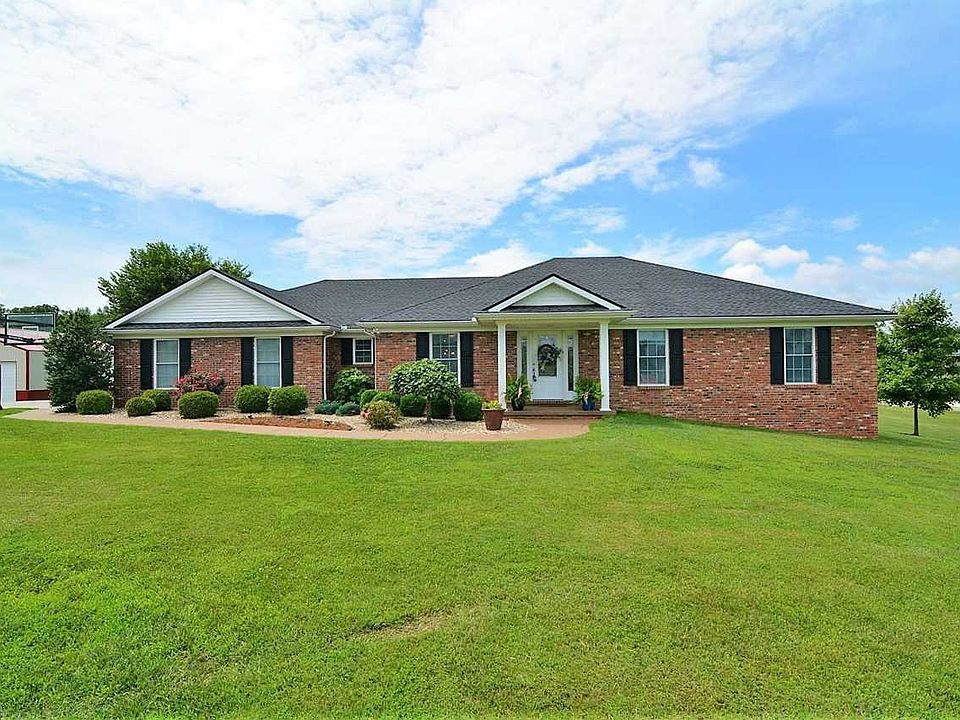 Beautiful custom-built sprawling brick ranch home with 2.5 acres on cul-de-sac. 5 bedrooms, 3.5 bathrooms and two full kitchens ideally designed for versatile living spaces. In-law studio apartment has two bedrooms and en-suite master bathroom including soaking tub, fully equipped kitchen and large 28' x 15' living room with private access to garage and east facing patio. Would be ideal for multi-generation living, at home office, huge master bedroom retreat, home theater, etc! Spacious rooms with high ceilings, cool and airy neutral colors, large windows and plenty of light. The family room has a wood burning fireplace, is open to the kitchen and has the feeling of relaxing in the clouds! Large main kitchen includes all appliances, breakfast bar open to dining area and living room. Half bath, walk-in pantry and mudroom near garage. Second master bedroom has en-suite bathroom with whirlpool tub, separate shower and double vanity. Covered back patio could easily be screened in, large open patio with fire-pit overlooks level yard and tree lined acreage. Super Clean Move-in Condition! 4th and 5th bedroom dimensions are in studio apartment area.