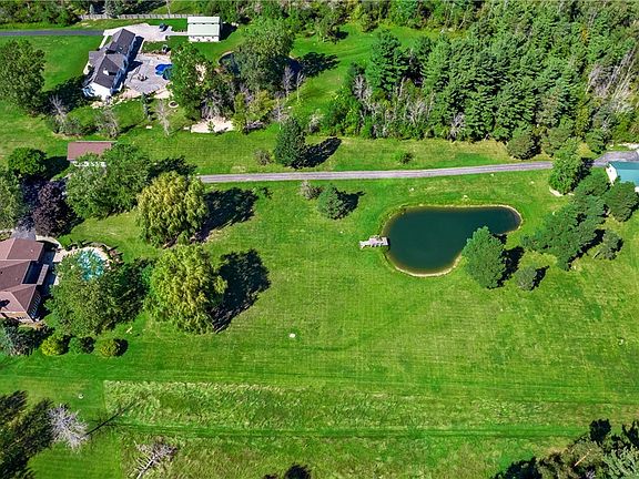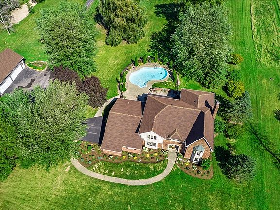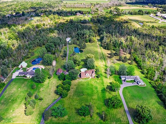 This 4,128 sf Tudor is peacefully situated on nearly 6 acres w/ views of the woods and stocked pond. You will be greeted by a 2-story foyer that flows past the living and dining rooms into the open concept kitchen & family room areas w/ wooden beams, gas fireplace (NRTC), and walls of windows overlooking the private yard with an in-ground pool. The eat-in kitchen features granite countertops & hardwood floors. Off of the gathering spaces, enter the private, stamped concrete patio & pool area, the perfect retreat surrounded by gardens and foliage. An office, laundry room, & 2 half baths complete the 1st floor. Up the staircase, find the the primary suite with bay windows, WI closet, and bath w/ double vanity, whirlpool tub, and separate shower. Three more bedrooms and a split full bathroom complete the 2nd floor. In addition to the attchd 2.5 car garage, this property offers a detchd 4 car garage and a massive pole barn, perfect for RV or boat storage, plus attached shop space for the hobby enthusiast. Updates include: roof (’18), furnace & A/C (’22), pro landscaping (’22), carpet (’22), pool filter & pump (’21/‘22).