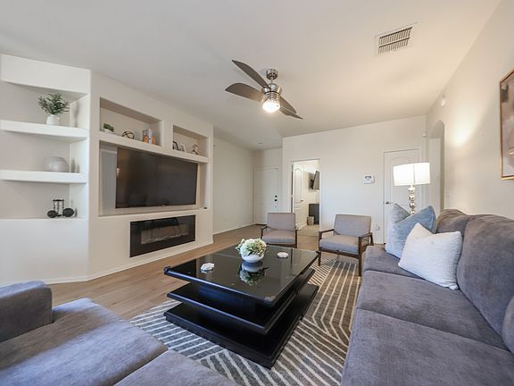 Covered patioNew flooringSleek built-in entertainment centerElectric gateDining areaNatural lightSliding glass doors